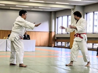 柔道整復師高段者大会では本会中山智史理事が世界形選手権8連覇の貫録を見せつけ、見事横四方固めで一本勝ち、林聖治会員が引き分けの結果となりました。
